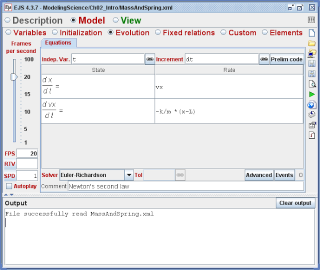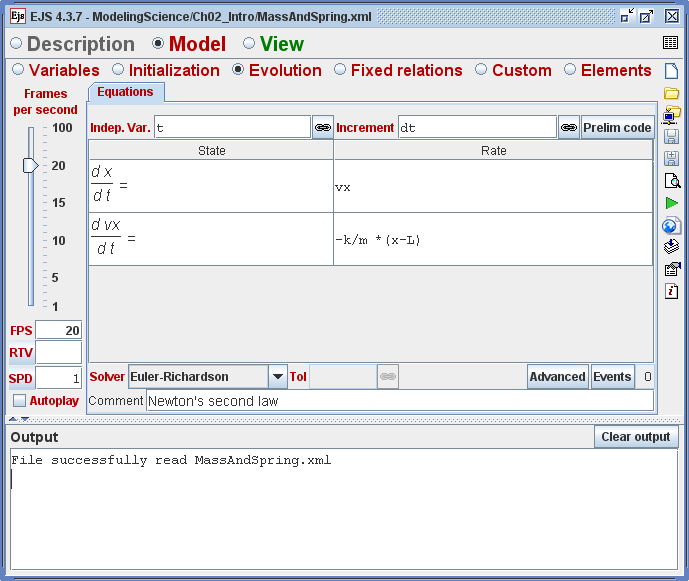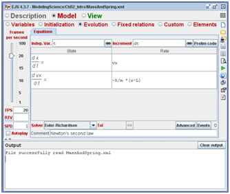 Figure 1. EJS authoring toolkit version 4.3.7 showing the Evolution Page with the Ordinary Differential Equations to model a simple spring mass system. |