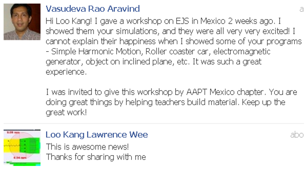 Loo Kang’s contributions is affirmed by Director General Education, Permanent Secretaries and senior management on 03rd May 2012, during an invited PS21 presentation sharing on Gravity-Physics by Inquiry (MOE, 2012a). The audience congratulates him on his passion and excellent idea-implementation on computer models for the betterment of the world. Many of the Open Source Physics Professors thank Loo Kang for his contributions in emails and face to face meeting (Wee, 2010a, 2012a) with face book message (Figure 1) being the most celebrated from Vasudeva Rao Aravind, Professor of Physics from Pennsylvania State University, USA .