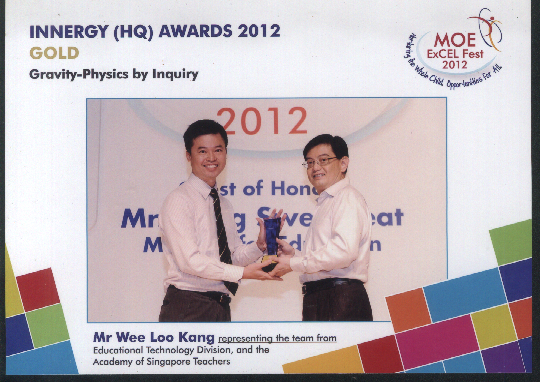 This document reviews the "Gravity Physics by Inquiry" project, which won the Innergy (HQ) Gold Award in 2012. This project developed and implemented four interactive computer models (simulations) designed to enhance the learning of gravity physics in Singaporean schools. The project leverages open-source resources and emphasizes inquiry-based learning.