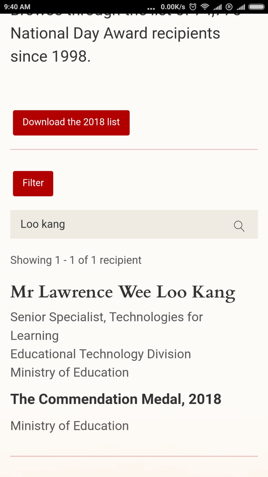 - Mr. Wee Loo Kang Lawrence, a Senior Specialist in the Educational Technology Division at MOE, was specifically mentioned in connection with this Commendation Medal.