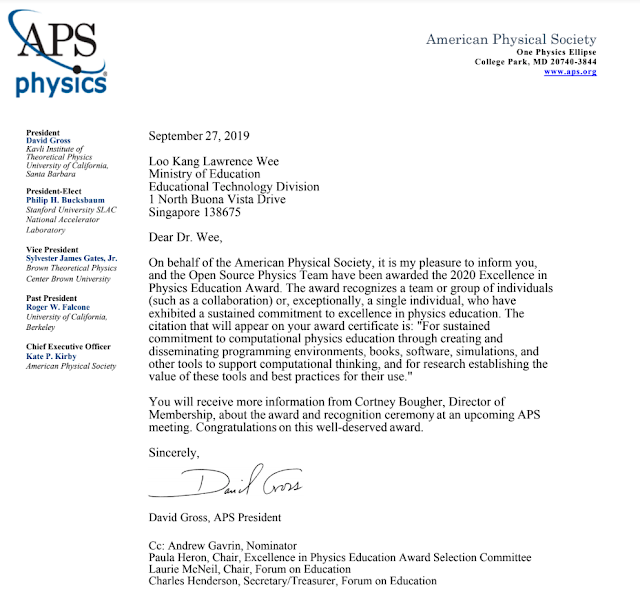 - (Mr. Wee's Facebook Post): "Open Source Physics team for the APS Excellence in Physics Education Award."