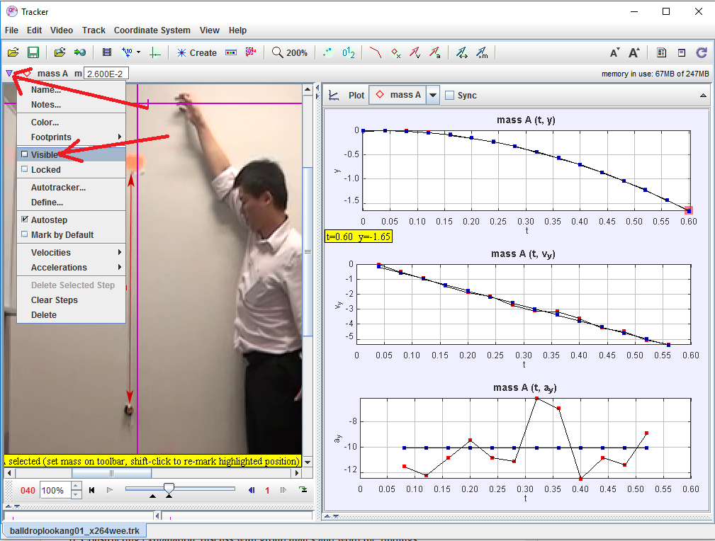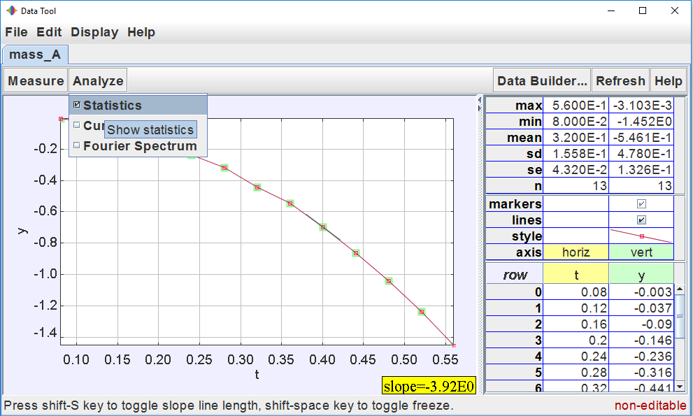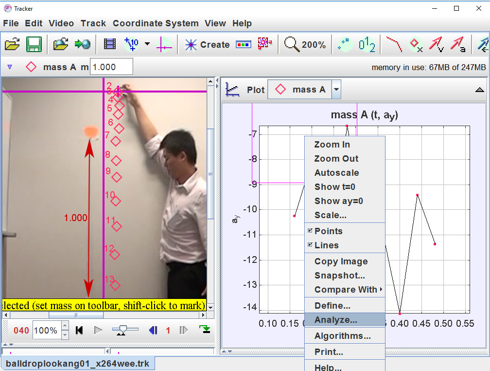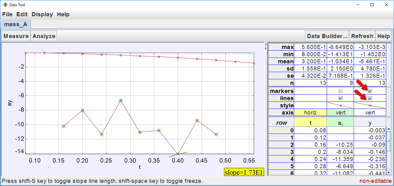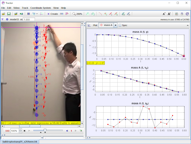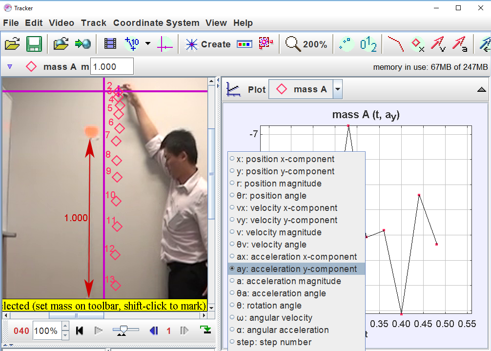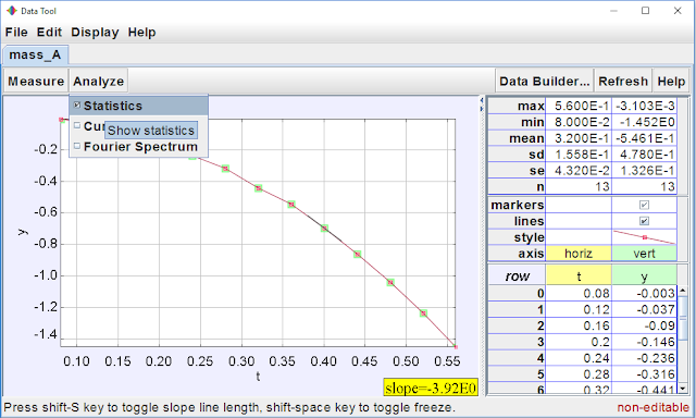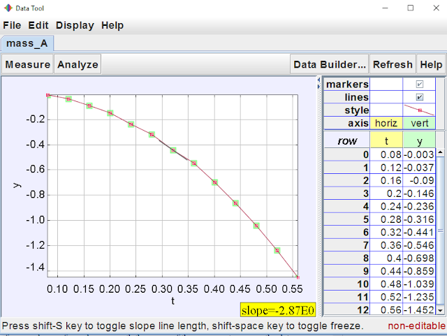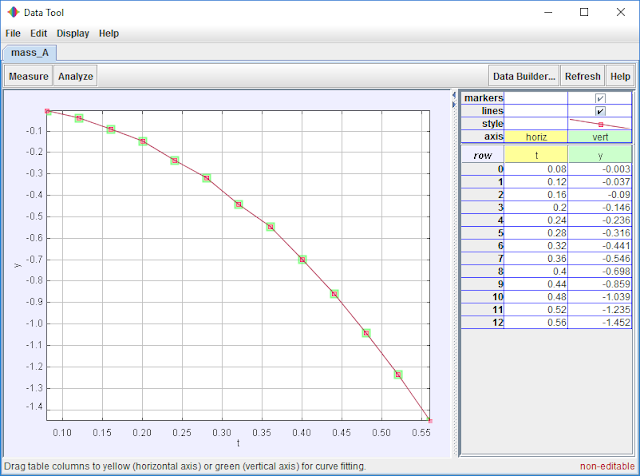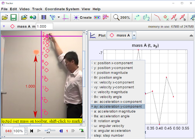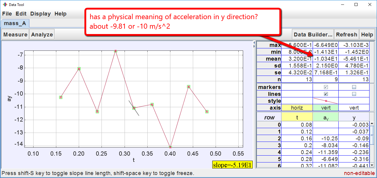 - typically average of y position isn't very useful as it is just an average of position y during the time duration of analysis, but now go back to the Tracker video and select ay instead of y
