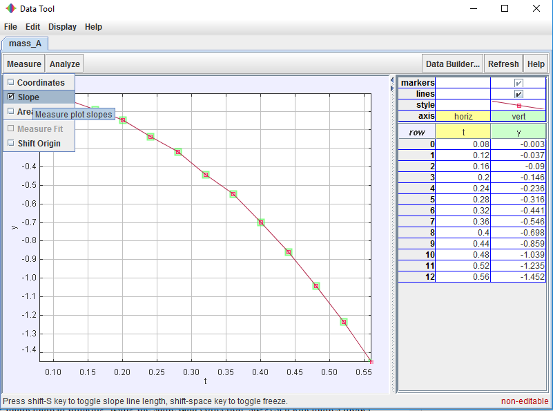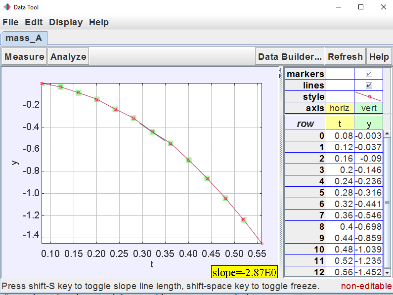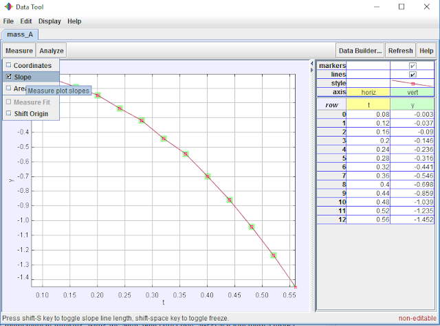 - move your mouse cursor to data point of interest, the bottom right corner shows the value for the slope, which is another name for gradient, which is slope = - 2.87 E0 where E means exponential = - 2.87 m/s