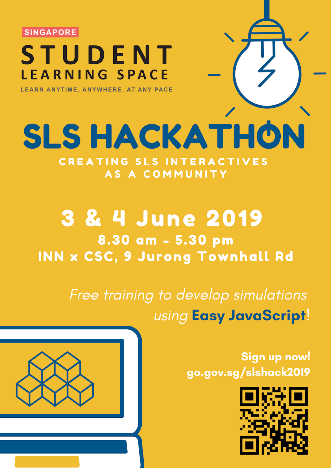 Congratulations! You/your team has been selected to participate in SLS Hackathon 2019, held on 3 – 4 June from 8.30 am – 5.30 pm at INN x CSC, 9 Jurong Town Hall Road, #03-19, S(609431).