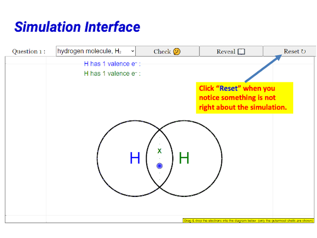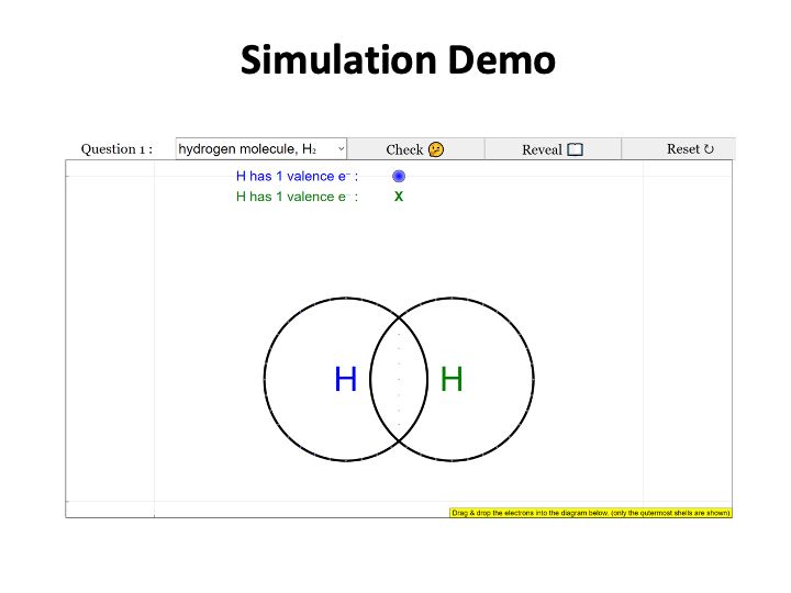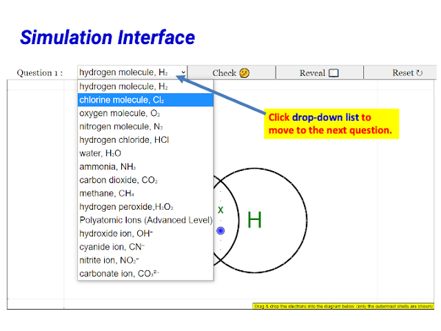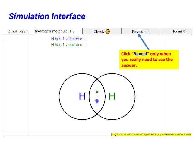- It will be good if the simulation does not have the circle already drawn. Coz sometimes students have problem knowing how the electrons are shared. E.g. carbonate ion, might not know carbon is in the middle. Or hydrogen peroxide where oxygen should be between the 2 hydrogen.