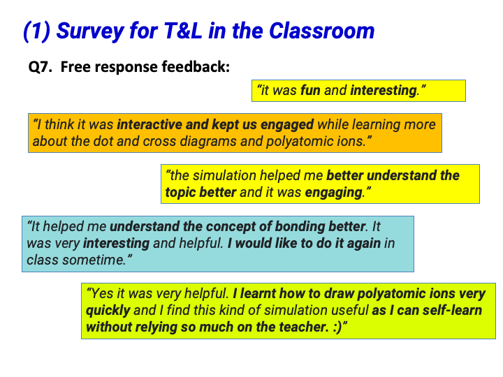 - Quote: "It includes polyatomic ions which is often promotes higher order thinking. It also give immediate feedback to students' answer"