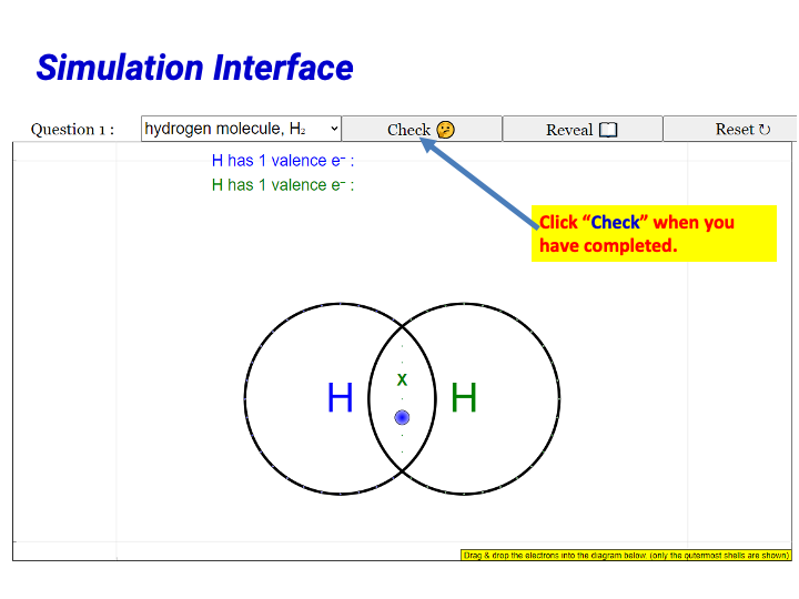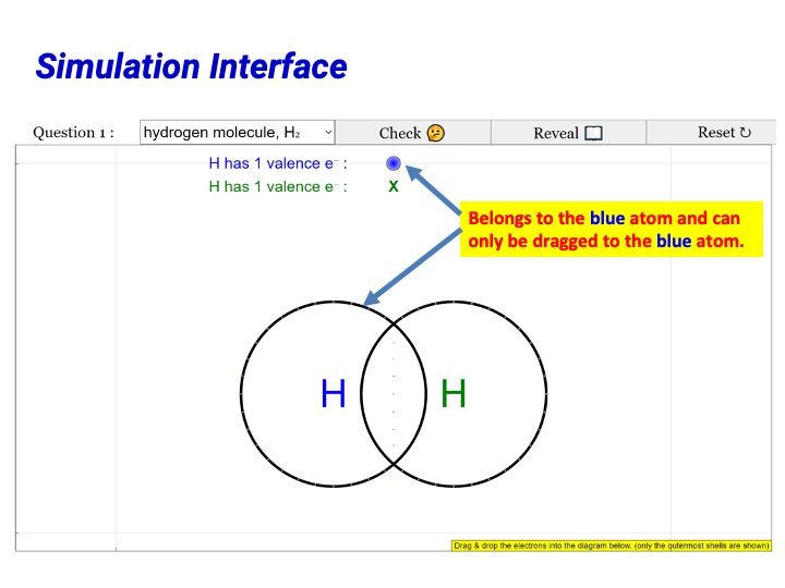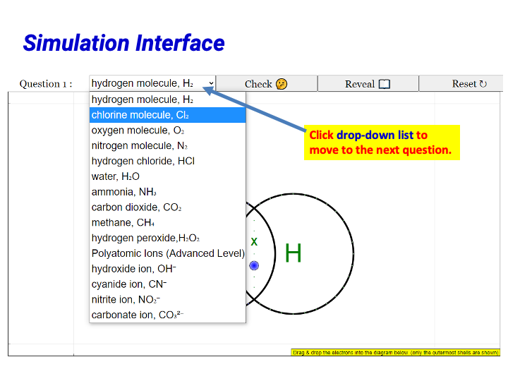- Quote: "It will be good if the simulation does not have the circle already drawn. Coz sometimes students have problem knowing how the electrons are shared. E.g. carbonate ion, might not know carbon is in the middle. Or hydrogen peroxide where oxygen should be between the 2 hydrogen."