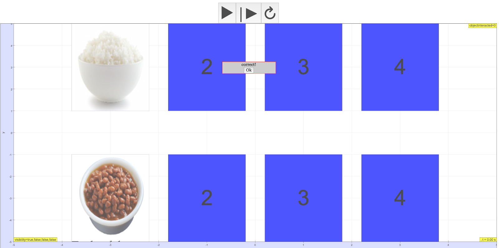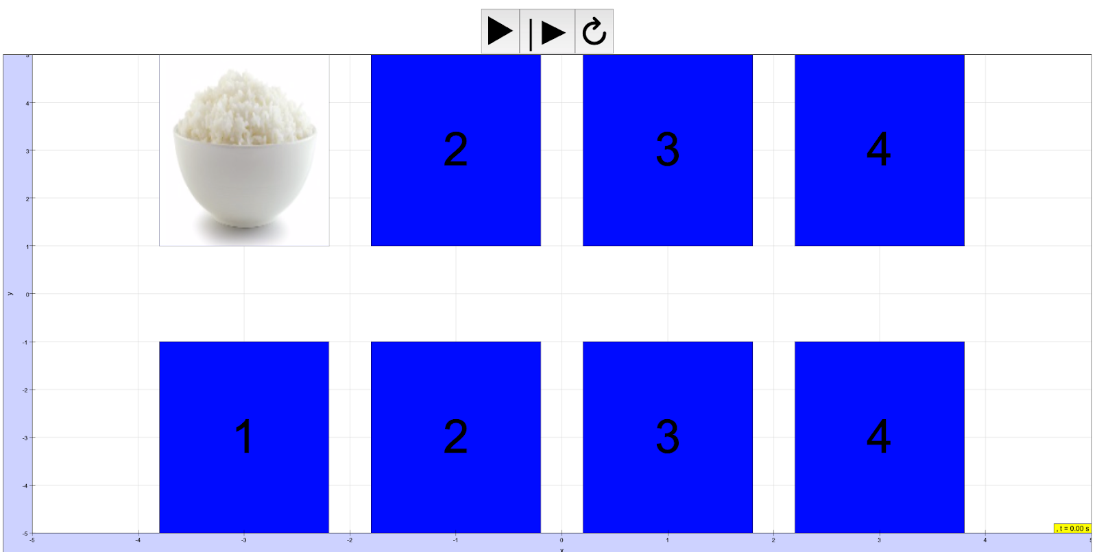 - run the simulation to test, the rice should appear only after the box 1 is press on.