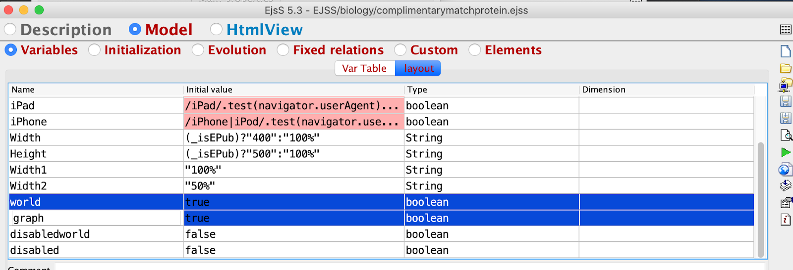 - similarly, HtmlView - plottingPanel2 - Properties - Display and Width and Height and add these code. The height is added with %% to force EJSS editor to accept this as variable and changeOrientation() is a custom function to make the Height as big as possible dynamically on different platforms