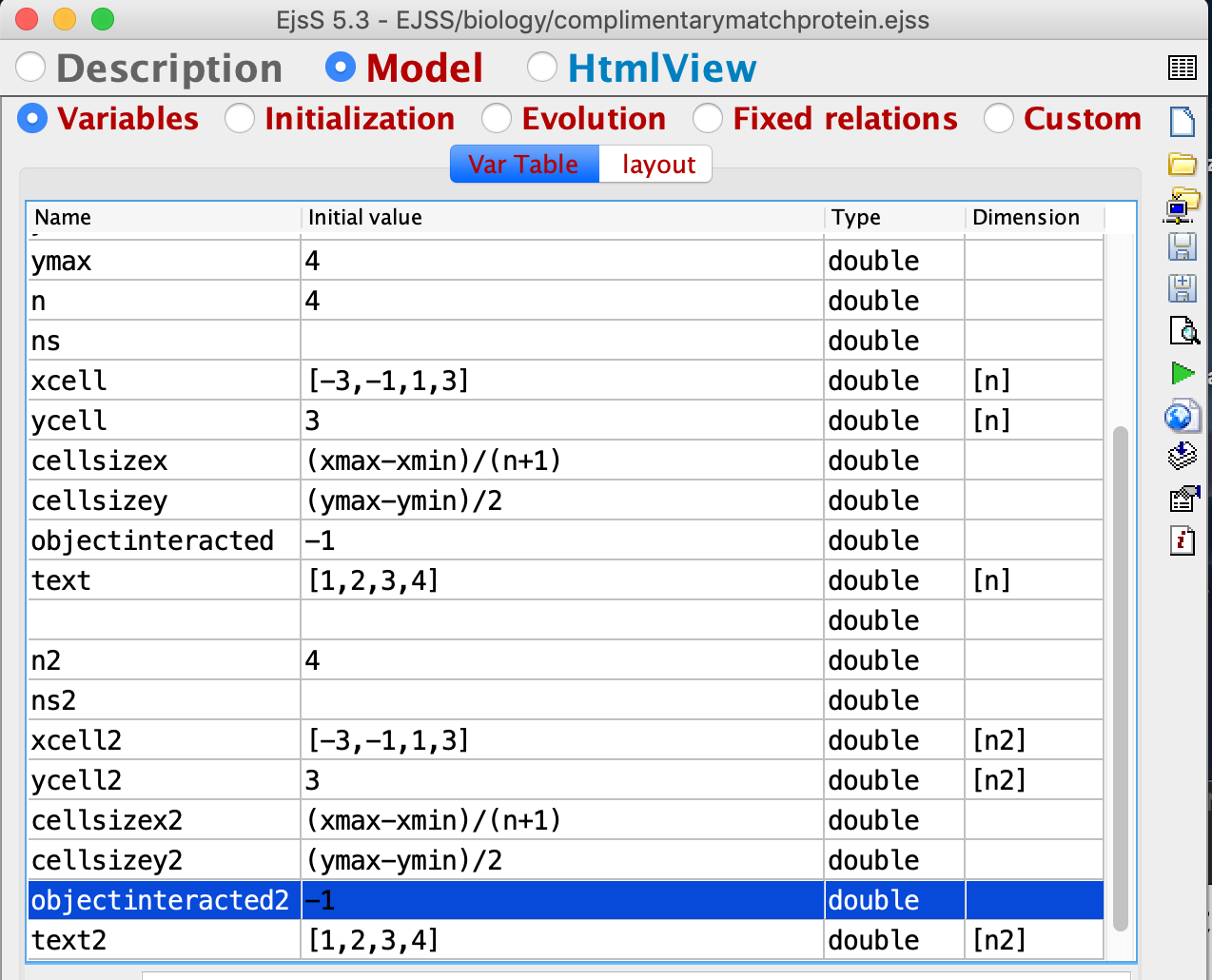 - as the simulation is interactive via touch on screen, and EJSS provides a way to know what variable or card is selected, go to Model - Variables - and add objectinteracted