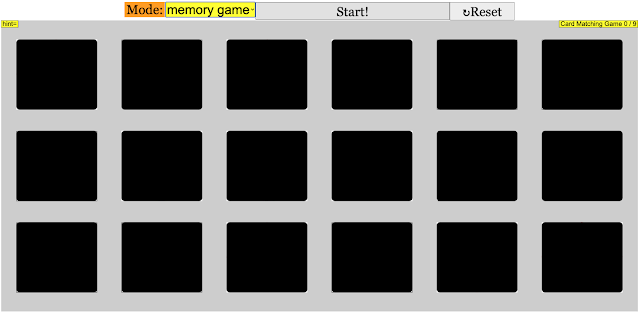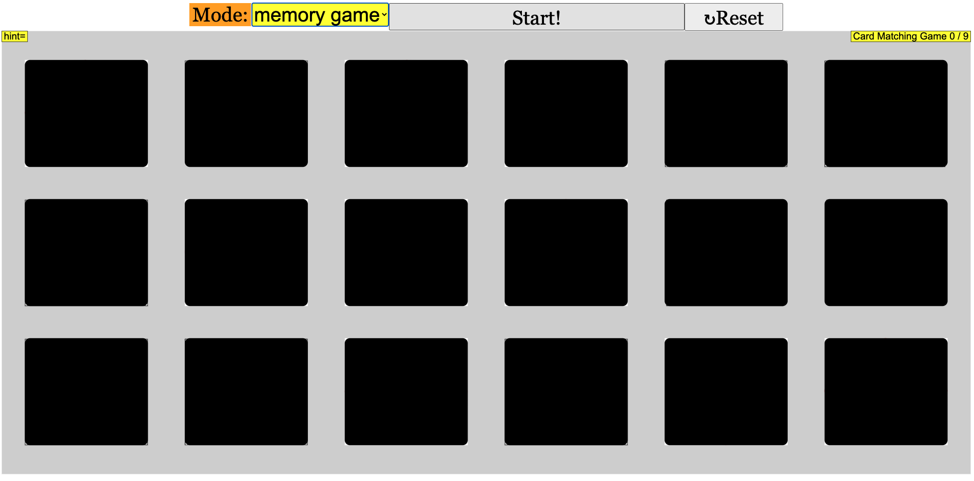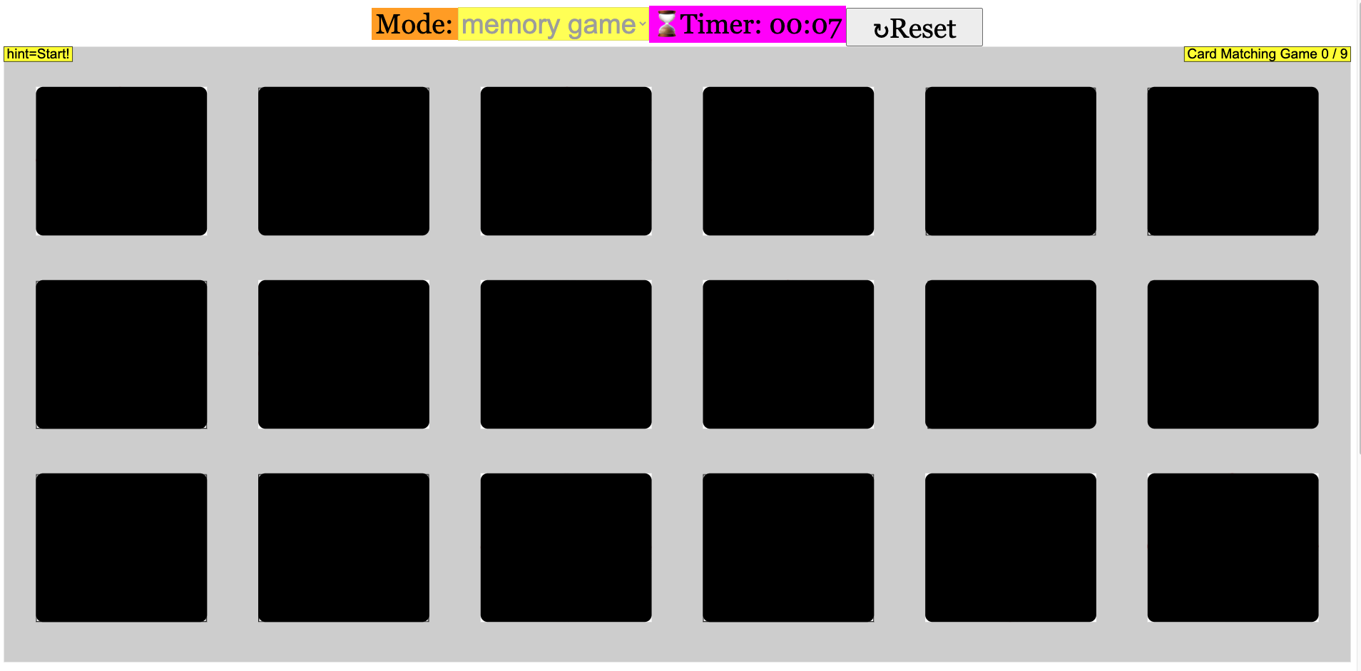 The sources mention at least two distinct game modes: "training mode" and "memory game mode." Training mode is designed for beginners and includes a timer. After starting in training mode, the game begins, and the timer starts. Upon completing all matches, the training session is finished, and players can reset to try another mode. The memory game mode is presented as an "advance challenge" where all cards are initially turned black (or presumably remain face down without a preview). Similar to the training mode, a timer begins after clicking start, and the game is completed when all cards are matched, allowing players to record their time and challenge others.