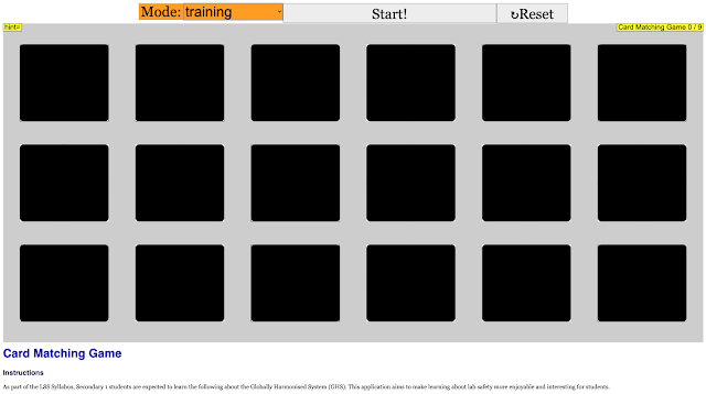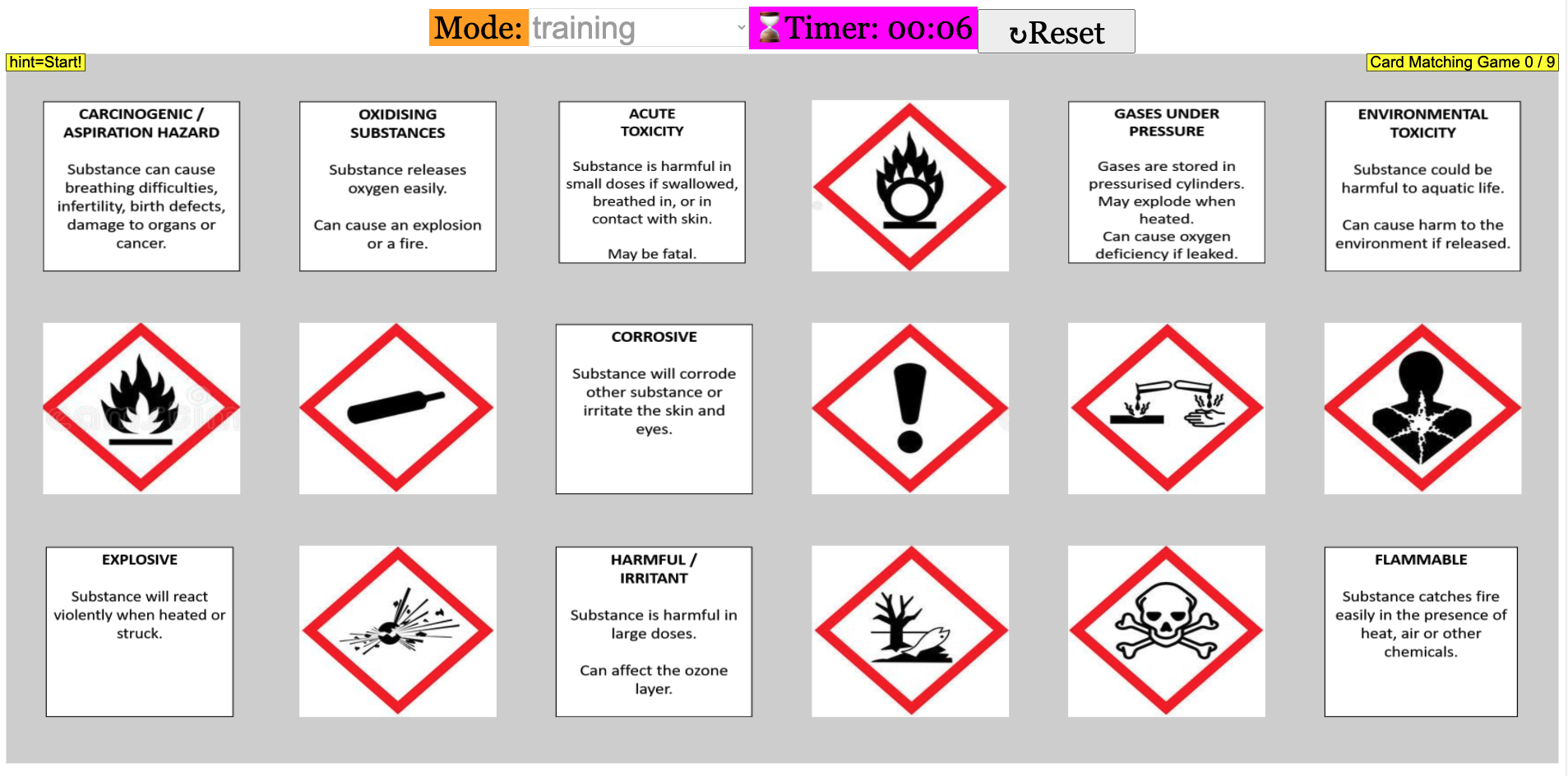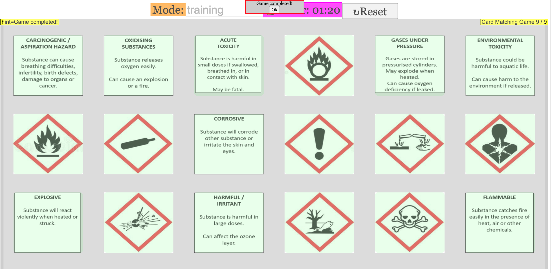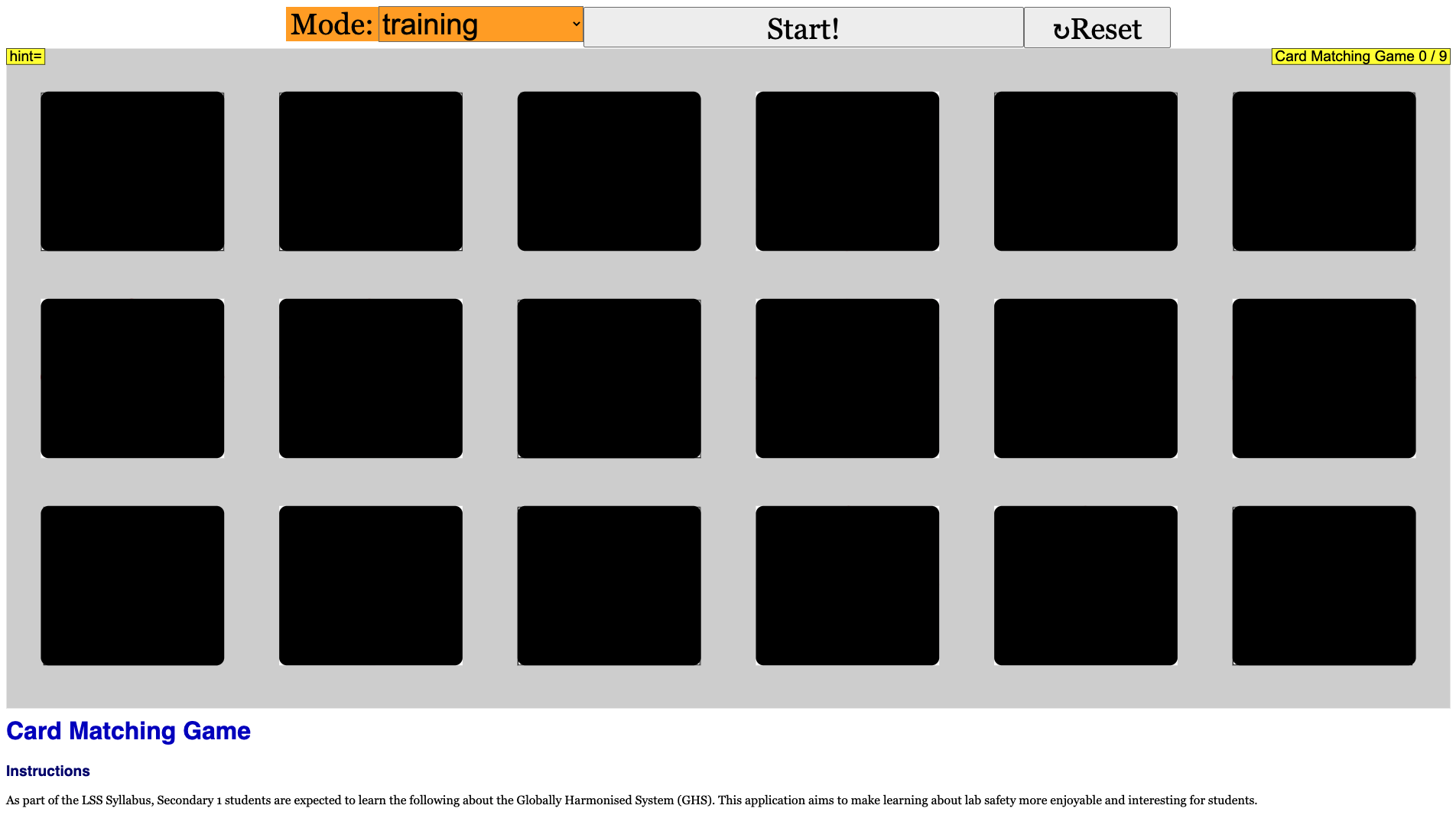The "Matching Game of 9 by 9 cards" is a simple memory-based game designed as a JavaScript HTML5 applet. It typically features 18 cards laid face down, consisting of 9 matching pairs. In the specific context of the provided sources, the game uses Globally Harmonised System (GHS) symbols and their corresponding explanations, aimed at helping lower secondary students learn about lab safety.