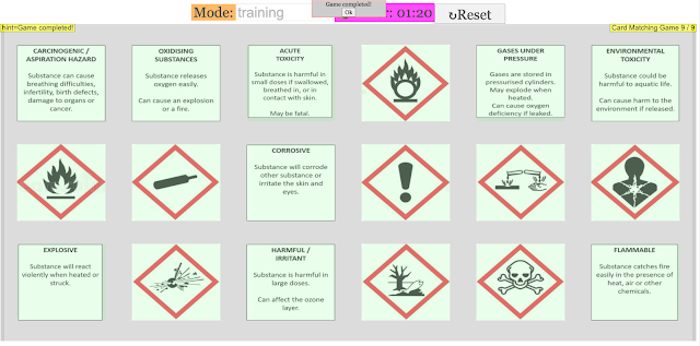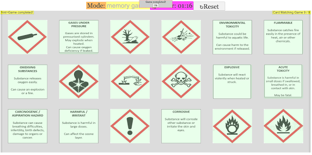 This study guide is designed to help you review the "Matching Game using GHS Symbols for Lower Secondary 2021 JavaScript HTML5 Applet." The game is an educational tool intended for Secondary 1 students to learn about the Globally Harmonised System (GHS) of classification and labelling of chemicals through a memory-matching activity. It features 18 cards, consisting of 9 GHS hazard symbols and 9 corresponding explanation cards. The objective is to match all nine pairs by clicking on two cards at a time. Correct matches earn points, while incorrect matches result in the cards being flipped back down. The game has different modes, including a training mode and a memory game mode for an added challenge.