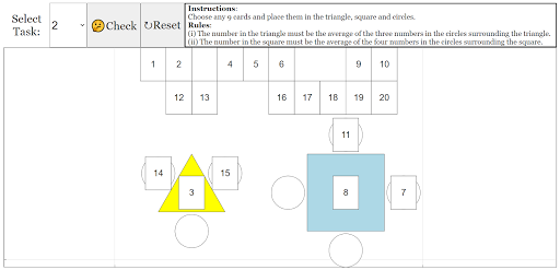 2. How do you play the game? Players are given a set of numbers that can be dragged and dropped into the circles around various shapes. The goal is to arrange the numbers in such a way that the number within each shape equals the average of the numbers in its adjacent circles. After arranging the numbers, players can use a "Check" button to see if their solution is correct.
