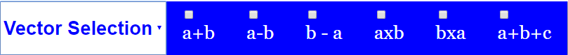 E3: Select a + b in the upper row. A thin red vector is affixed to a, whose length and direction are those of b. A thick red vector starting at the origin is the sum vector. Describe its geometric construction. (mentally complete the 3 vector to a parallelogram ). Convince yourself by rotation of the frame, that a, b and a+b are in one plane.