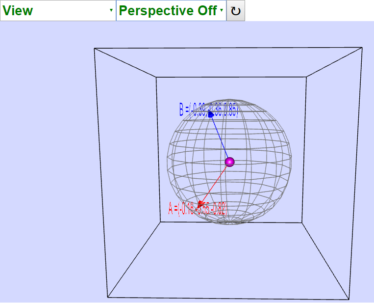 - Generating New Vectors: The "new vectors" button creates two (or three with the corresponding checkbox activated) vectors with random orientations, visualized as blue arrows originating from the magenta origin and ending on a unit sphere.
