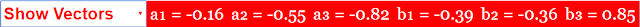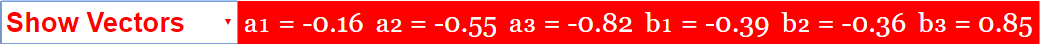 - The "new vectors" button generates two new vectors, labeled a and b, with random orientations in 3D space. Initially, all generated vectors have an absolute value (length) of 1 and start at the magenta colored origin (0, 0, 0).