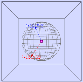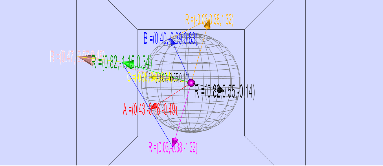 This simulation visualizes the basic vector operations in 3D. Activating the button new vectors generates vectors of random orientation, drawn as blue arrows. For better clarity all arrows have an absolute value (length) of 1 and start at the magenta colored origin. They are embedded into a sphere of radius 1, that is shown as a transparent mesh.