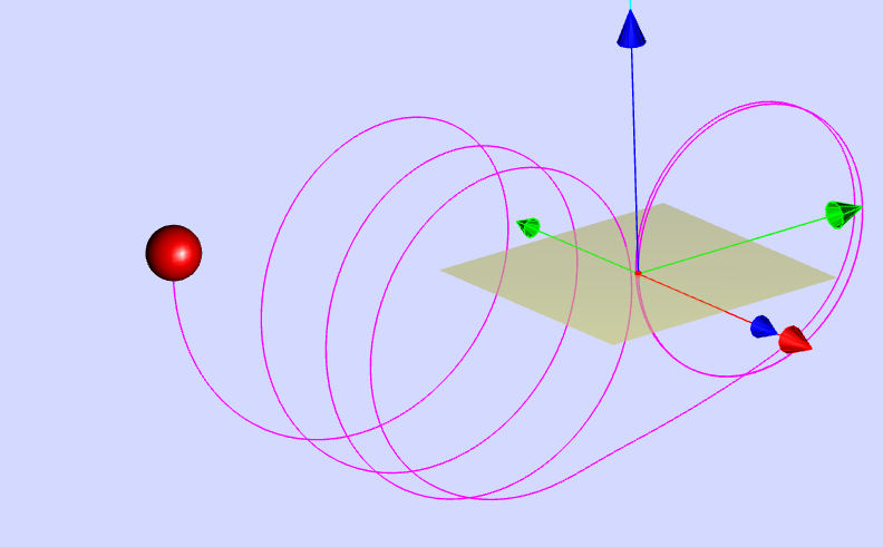 At default a homogenous magnetic field of value 1 is oriented along the x axis. There is no electric field. The electron, initially positioned at the origin, starts with an initial velocity vector in the z direction of value 1/2. With these initial conditions it will follow a circular path around an axis parallel to that of the magnetic field (x axis). The vector of the magnetic field is shown as a thick, red arrow.