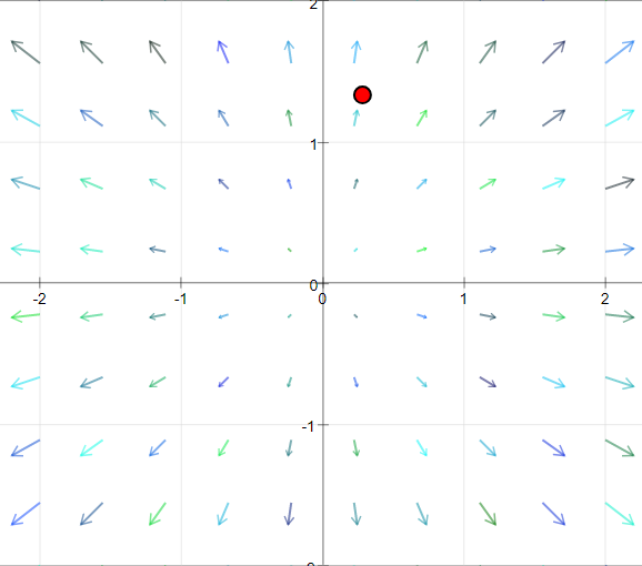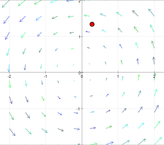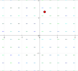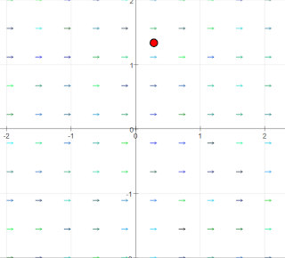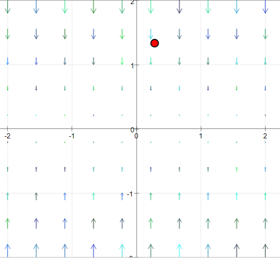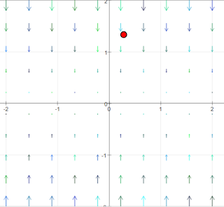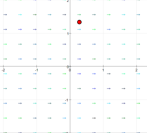 A red test object lies in the vector field that will follow the flow vector both in direction and value once the start button is activated. It jumps back to its initial position when it crosses the limits of the field. Step causes one step of movement.