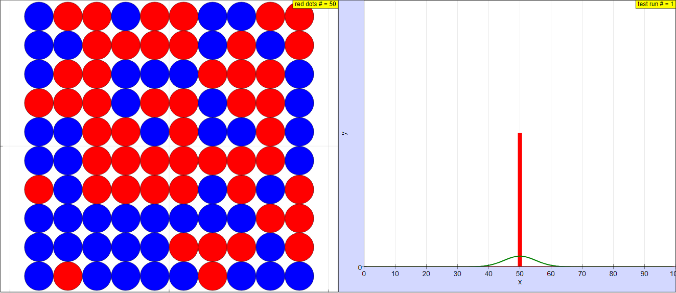 - "Each coins in the applet can be up or down (represented by red or blue dots) The applet simulate 100 coins were throwed each time and total number of coin in the up state will be added to the diagram. The distribution become gaussian distrbution as the number of run increase to large value"