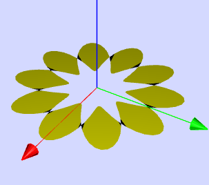 At start of the simulation you will see the projection of a closed band in space, viewed under perspective distortion. It is embedded into an x y z tripod, and is accompanied by the x y- plane z = 0. This plane can be deactivated by its check box.