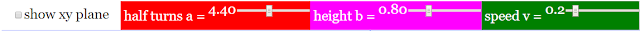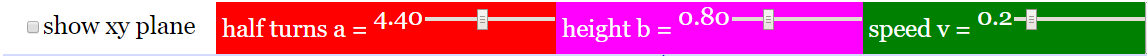 - When "Play" is activated, the animation starts by increasing the time variable t linearly. The slider "v" defines the speed of the rotation of the band around its symmetry axis due to the periodic modulation terms in the coordinate functions.
