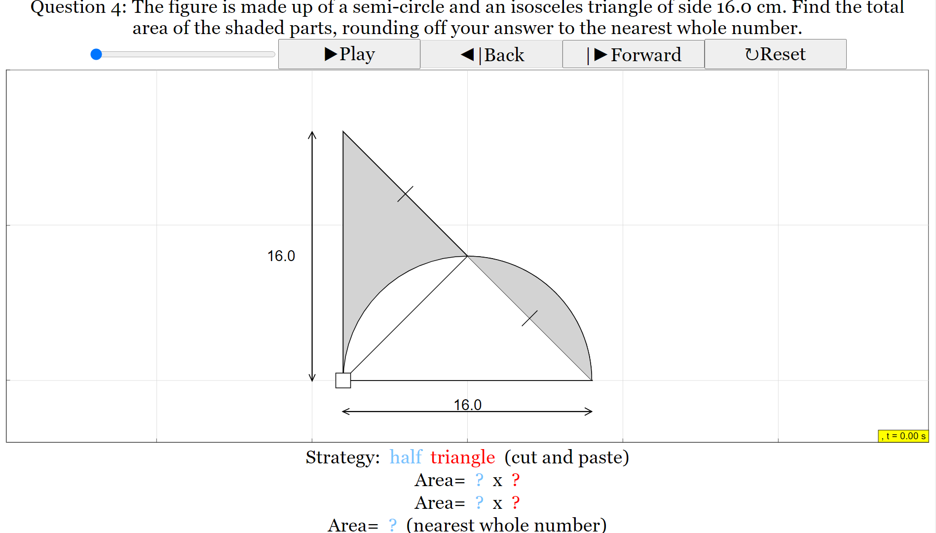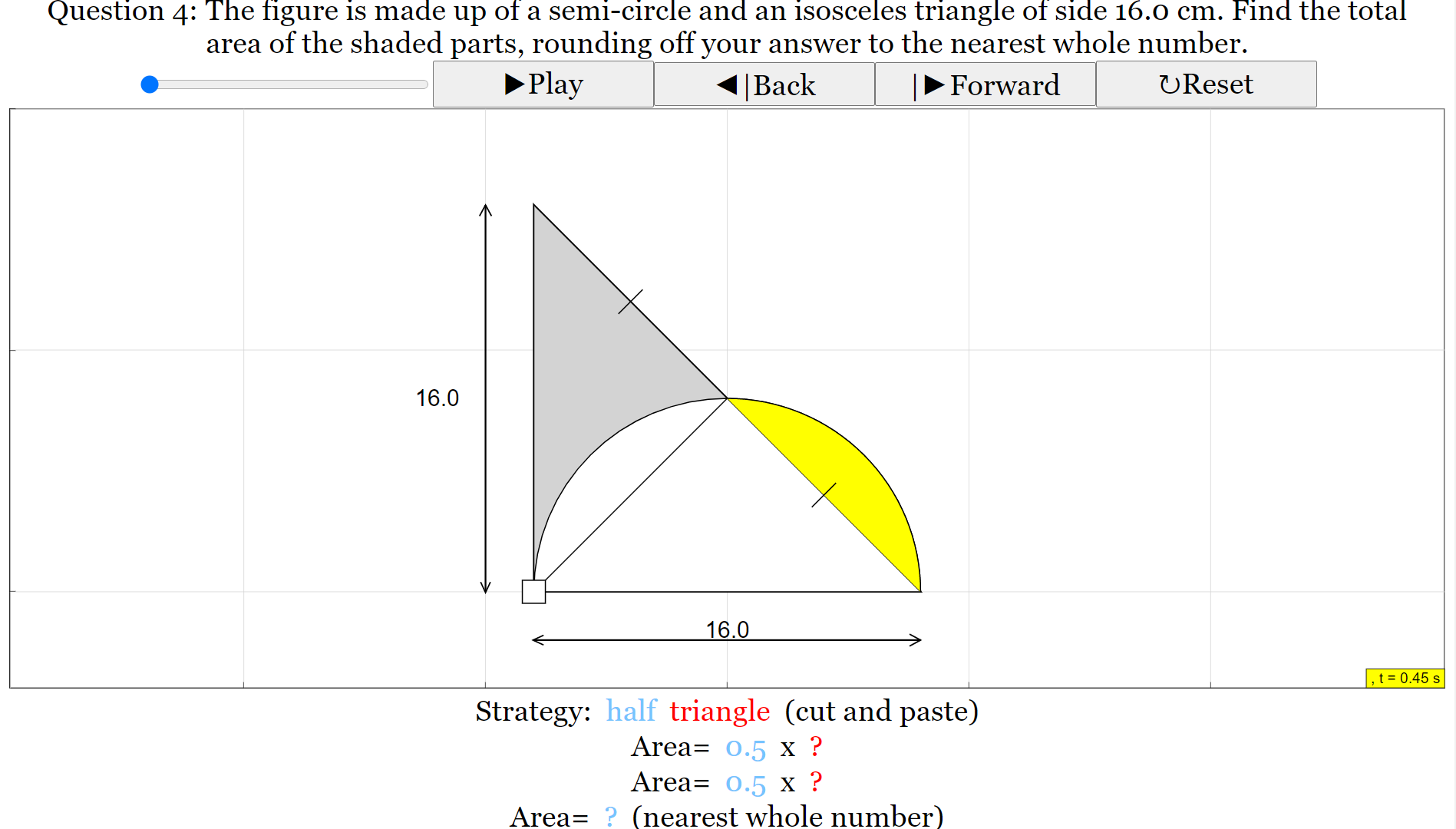 The user can start the simulation by pressing the play button or step through it using Forward and Back controls. Initially, a shaded area (likely a segment of a circle) is displayed. Once the simulation begins, this shaded area turns yellow to draw the user's attention to its movement. An animation then plays, shifting this yellow segment to the left side, ultimately forming a complete triangle.