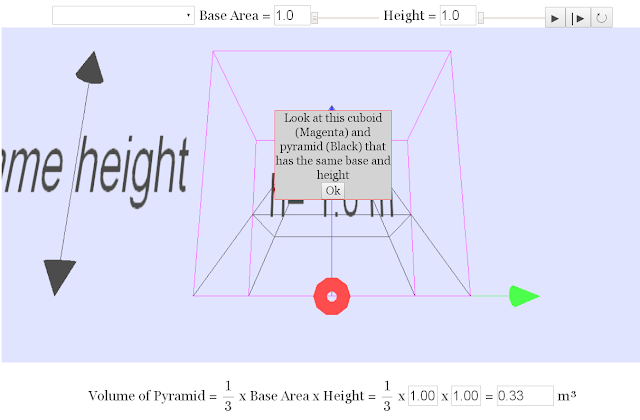 Play to look at this cuboid (Magenta) and pyramid (black) that has the same base and height Volume of Pyramid in 3D WebGL JavaScript HTML5 Applet Simulation Model https://sg.iwant2study.org/ospsgx/index.php/554 |