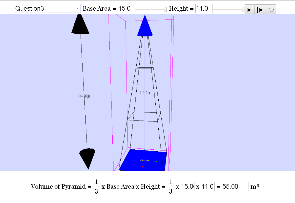 Question 3: Toggle the arrows to view the pyramid in 3D Volume of Pyramid in 3D WebGL JavaScript HTML5 Applet Simulation Model https://sg.iwant2study.org/ospsgx/index.php/554 |