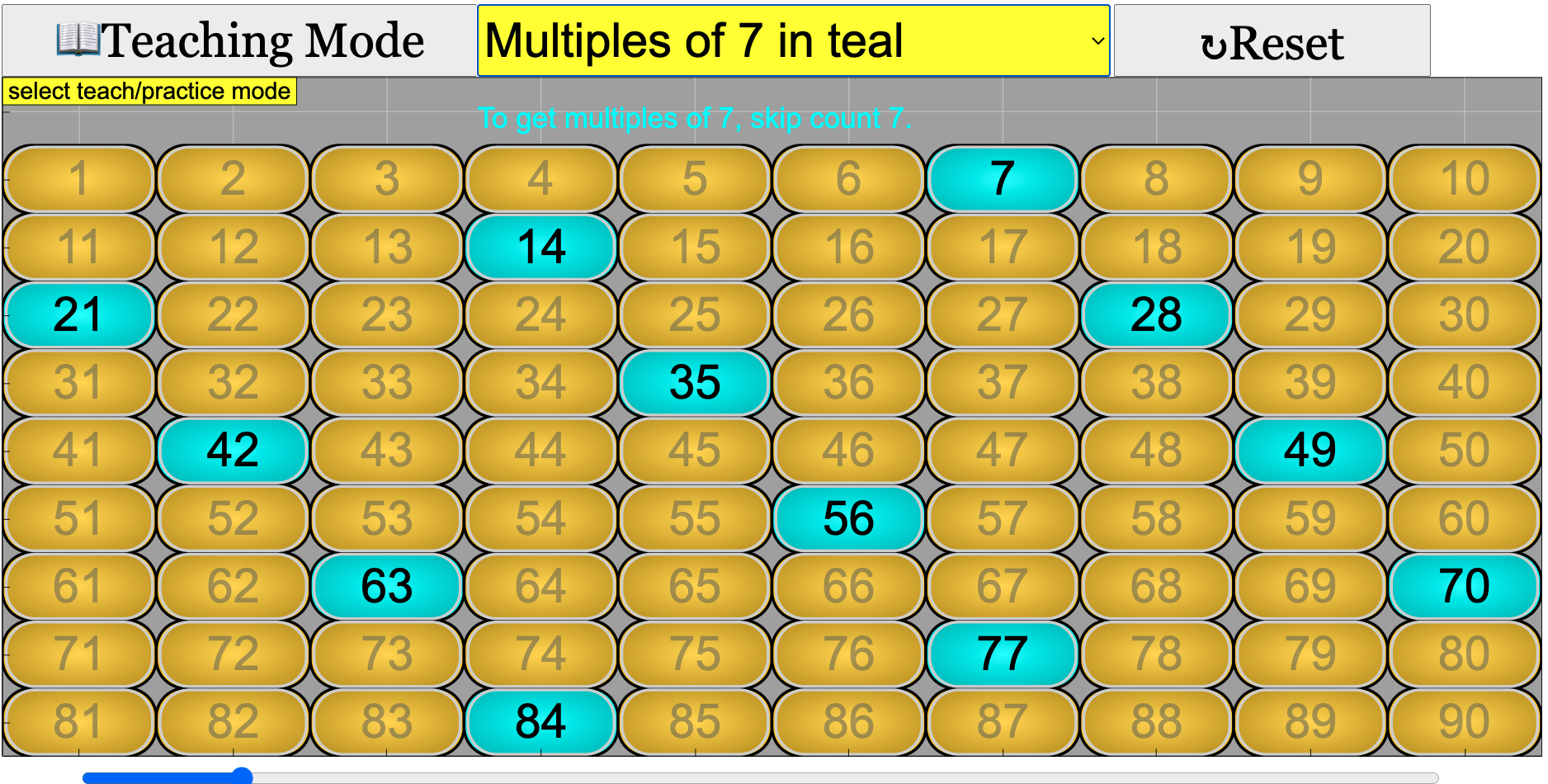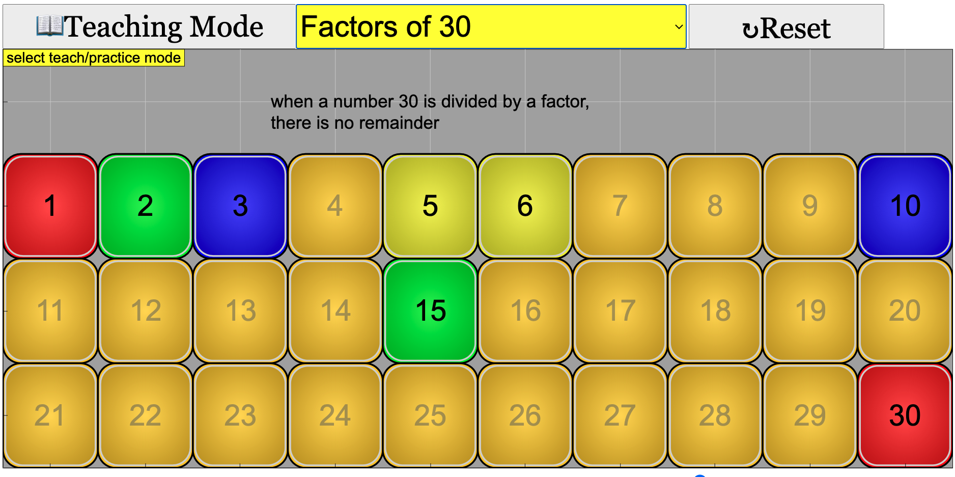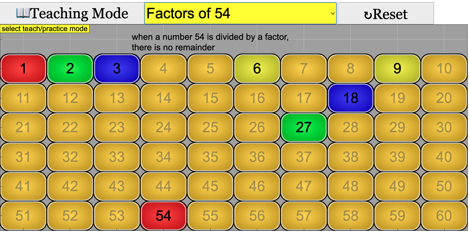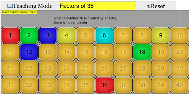 - Multiples: Multiples are presented as the result of "skip count[ing]," making it easier for students to grasp. For example, "multiples of three is skip count three, for example, 3, 6, 9, 12, ...." The resource emphasizes the use of color-coding in simulations to aid pattern recognition for multiples.