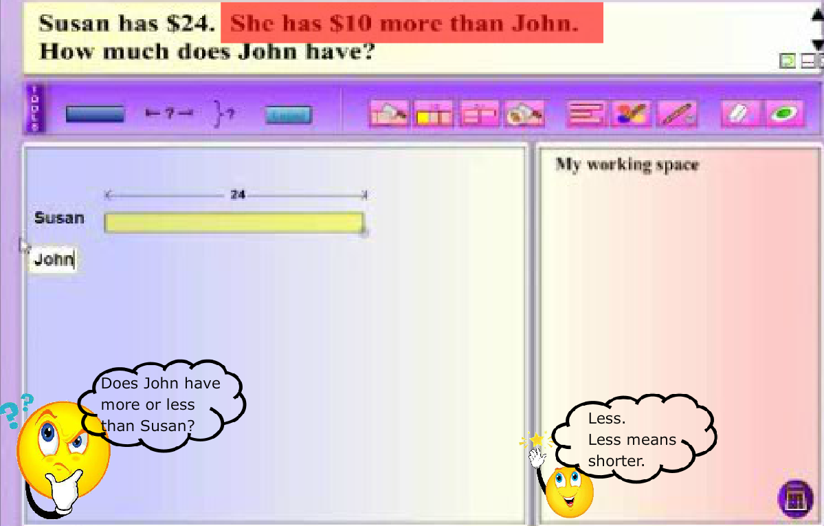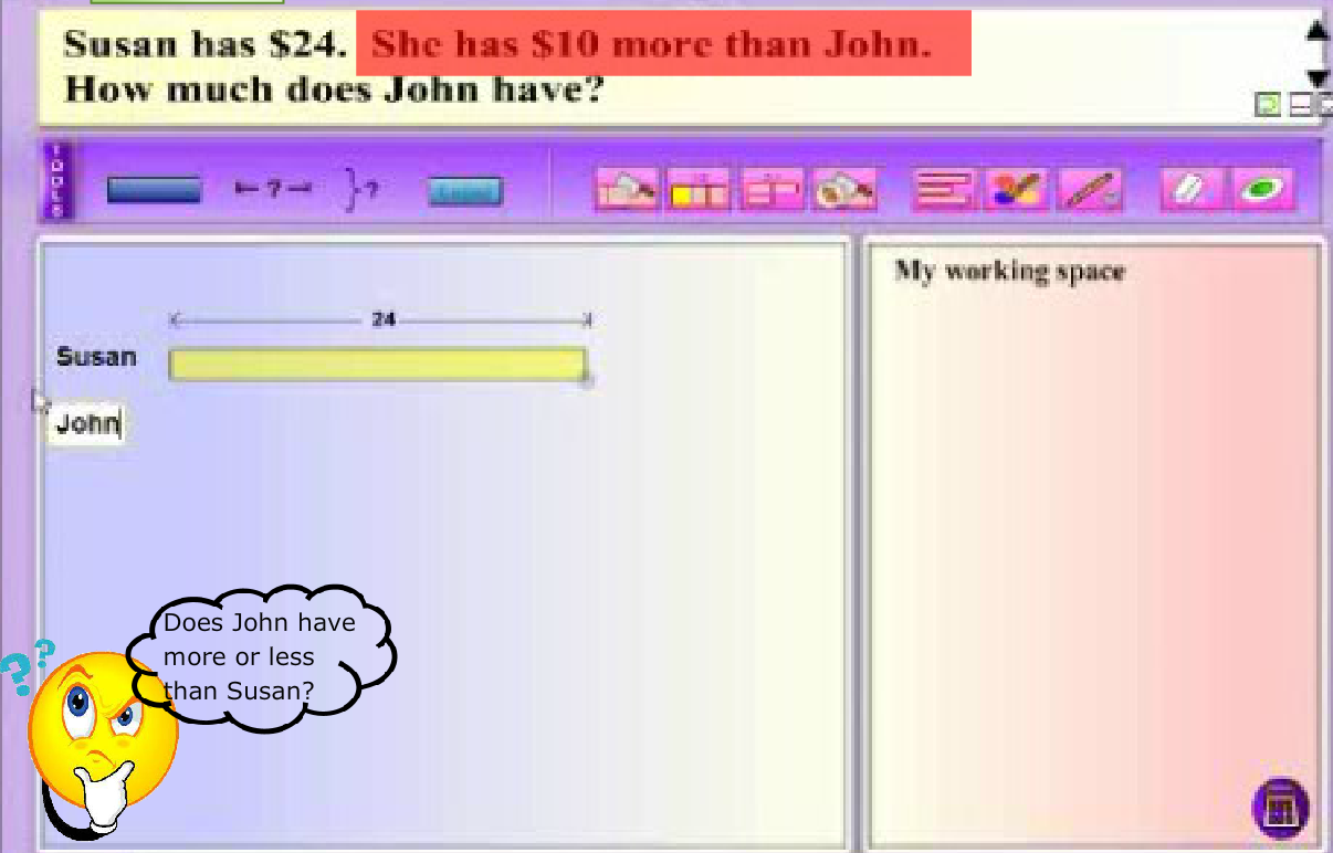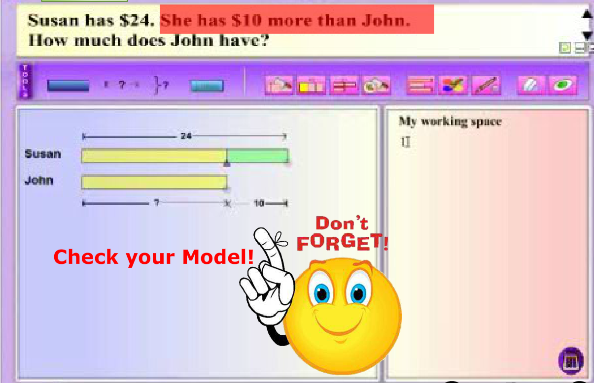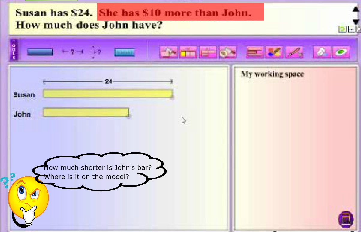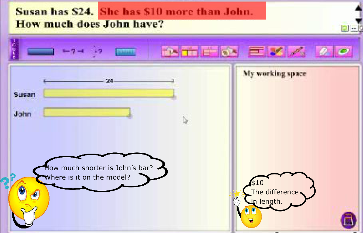 Modeling thinking aloud combines elements of both systematic and explicit instruction, and posing questions. MaPS, with its dynamic visuals and interactive capability, is effective in providing the visual support for students to make the connection between knowns and unknowns in a word problem.