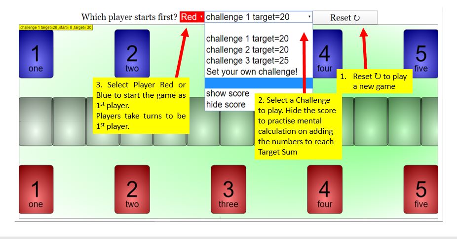 - The target sum for Challenge 1 is 20. The number cards available to each player in this challenge contain the numbers 1 to 5.