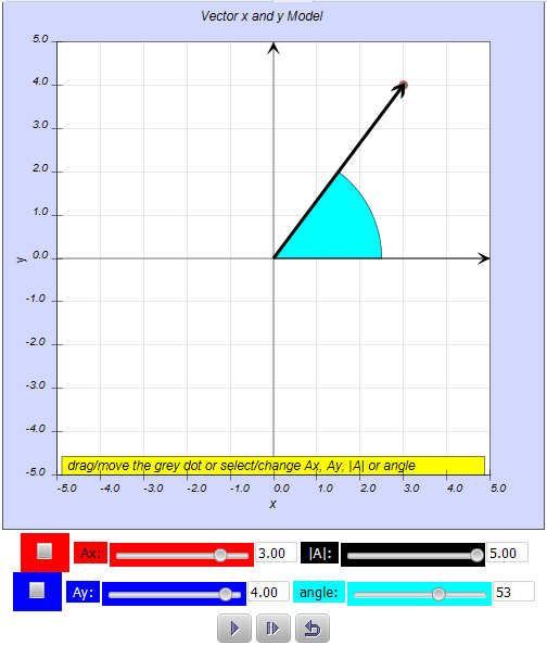 1. this model can be used to calculate any length |A| by keying in the values such as |A| =500 and theta = 63 degrees. Select the checkboxes Ax and Ay to see the new answers.2. when Ax is selected, the PLAY button animates the effects of changing Ax alone.