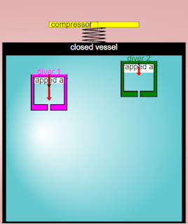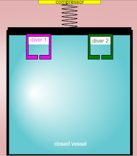 - The adjustable compressor changes the volume of the container, and changing the volume affects the pressure within the fluid via Pascal's Principle. This pressure change is applied equally throughout the fluid and acts on each diver.