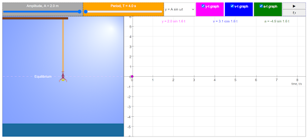 - Simulation Description: "This simulation shows the speed, velocity and acceleration graph of a Bungee jump." (SHM Bungee SVA Graph HTML5 Applet Javascript webpage)