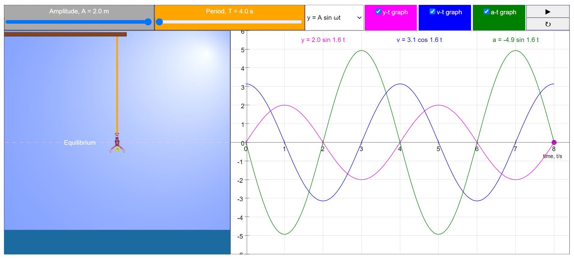 - Teaching SHM: The simulation provides a visual and interactive way to introduce and explain the concepts of Simple Harmonic Motion, including displacement, velocity, and acceleration, in a context more engaging than a simple mass-spring system or pendulum.