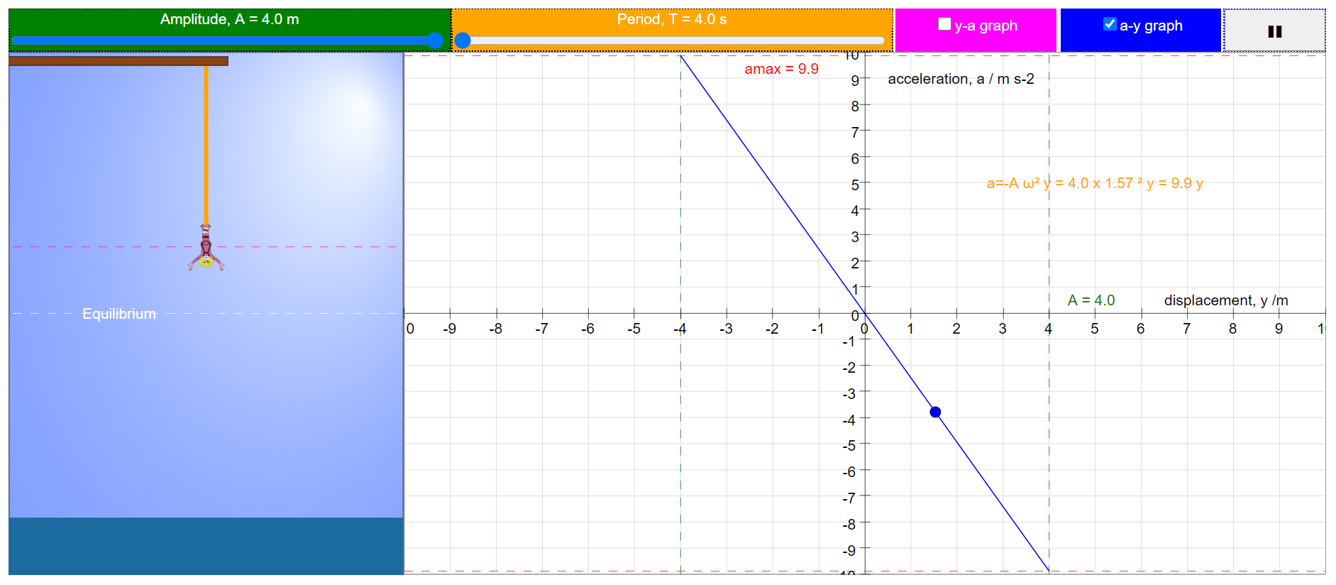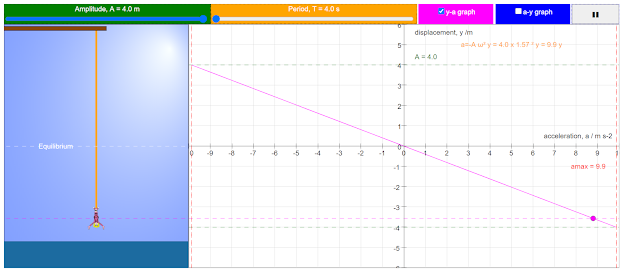 - Acceleration vs. Displacement Relationship in SHM: The HTML5 applet specifically focuses on the relationship between acceleration and displacement in the context of bungee SHM. In ideal SHM, acceleration is directly proportional to the displacement and in the opposite direction (a ∝ -y). The applet allows users to visualize this relationship graphically.