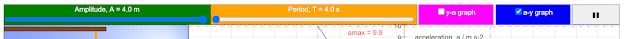 - Two adjustable variables in the applet are Amplitude and Period. Changing the amplitude would alter the maximum displacement and acceleration values displayed on the graph, while changing the period would affect the frequency of the oscillations and potentially the shape of the traced path if viewed over time.