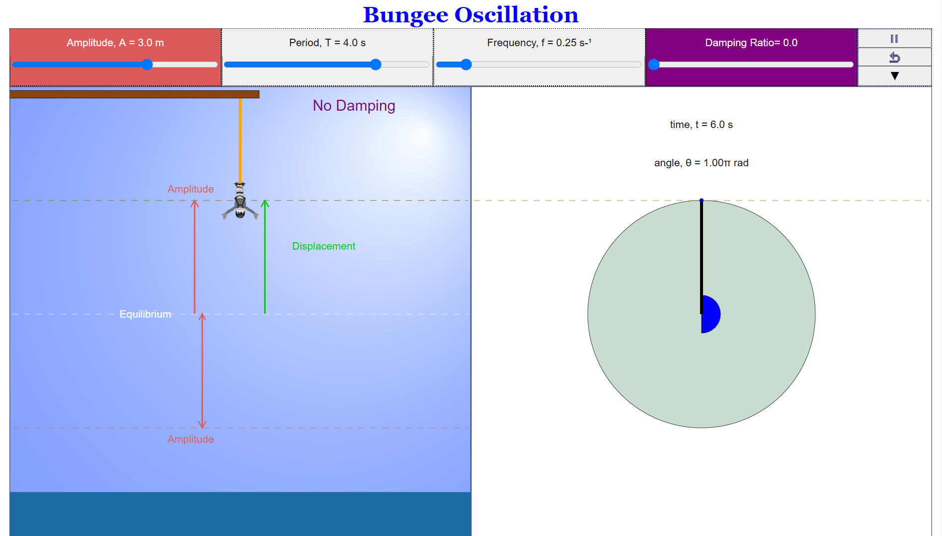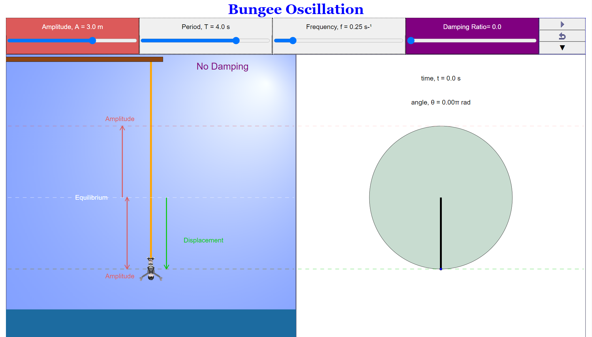 - (From "SHM Bungee Phase Circle & Damping HTML5 Applet Javascript"): "The Controllable variables are the Amplitude, Period, Frequency and Damping Ratio." (For Teachers section)