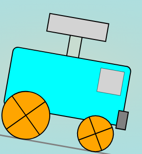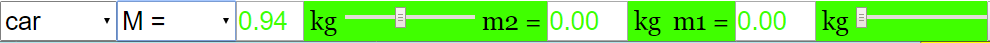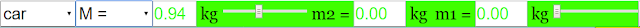 This simulation uses Easy Java Simulations (Ejs) to model the problem of a rocket car on an incline plane. When the car reaches the bottom of the incline it can be set to bounce (elastic collision) with the stop attached to the bottom of the incline. The total mass of the car is 2.0 kg which consists of the car body (1 kg), two front wheels (0.4 kg) and two rear wheels (0.6 kg). The front and rear wheels rotate and are uniform disks. In the simulation you can set the incline angle (in radians), the bounce, the thrust of the car's rocket (in Newtons), and you can drag the car to its initial position.