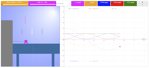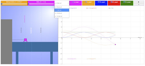 - Displacement and Velocity Graphs: Alongside the energy graphs, the applet includes displacement (x) and velocity (v) over time (t) graphs, indicated by "the 2 dotted lines".