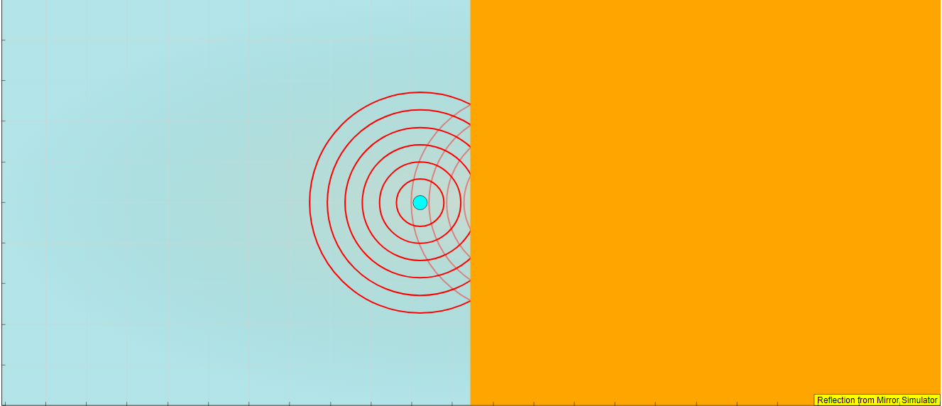 The simulator offers several controls for user interaction. There is a "Show Inside Mirror CheckBox" that allows you to toggle the visibility of the reflecting wall (represented as an orange mirror). Sliders are available for adjusting various parameters of the wave or the simulation (though the specific parameters adjustable by sliders are not detailed in this excerpt). Play/Pause and Reset buttons allow you to control the simulation's animation and return it to its initial state. A double-click on the screen enables toggling to full-screen mode for better visualization.