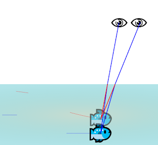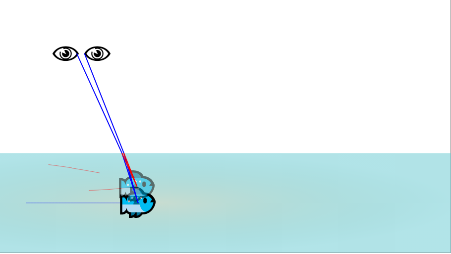 - When the position of the fish or the eyes is changed, the line of sight adjusts to reflect the new angle of observation, and the image of the fish changes based on the amount of refraction occurring at the water-air interface. This models the effect of changing perspective on observed position.
