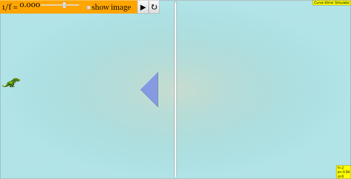 - Adjusting Curvature: The slider labeled "1/f" controls the mirror's curvature. Moving the slider left increases curvature (mirror curves towards the object), while moving it right decreases curvature (mirror curves away from the object).