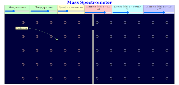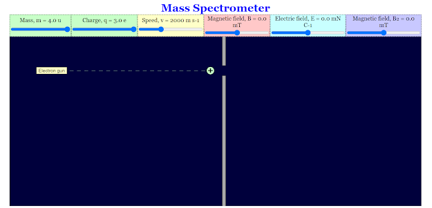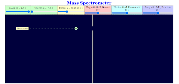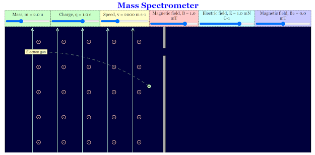 This is the simulation of a mass spectrometer where students are allowed to manipulates mass, charge, speed, magnetic field, electric field