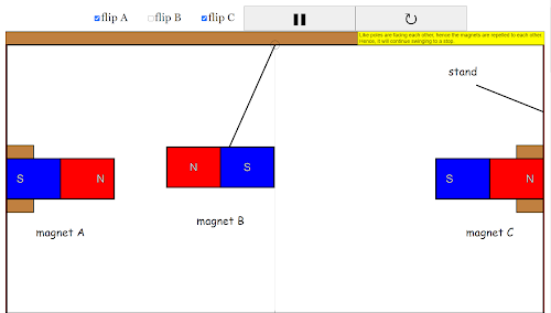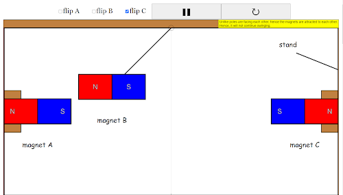 - Forces Affecting Motion: The simulation models the forces acting on the swinging magnet, including "tension in string && weight (+ attraction / repellsion)." The attraction or repulsion is due to the magnetic interaction between magnet A and the swinging magnet B. This directly relates to the polarity of the magnets.