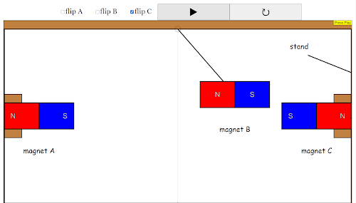 - Describe what happens to the interaction between magnet A and magnet B when the polarity of magnet C is flipped, based on the "Initial setup".