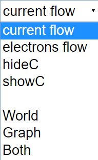 - The simulation's combo box offers different display options such as "World," "Current Flow," and "Show C" (presumably showing the capacitor). Different combinations allow users to visualize electron flow with or without the capacitor being explicitly shown.