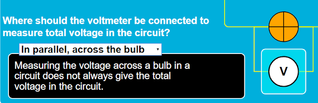 - The simulation includes a question with a dropdown combo box. By selecting an option, the voltmeter position will change to match the selected connection type, and a pop-up explanation box will appear, providing feedback on whether the connection is correct or not. This function is important to promote deeper learning by combining visual interaction with written guidance.
